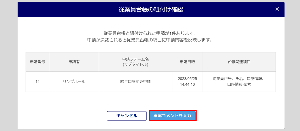 [承認]クリック時に申請内容に従業員台帳と紐付けられた項目がある場合は、「従業員台帳の紐付け確認」ウィンドウが表示されます。