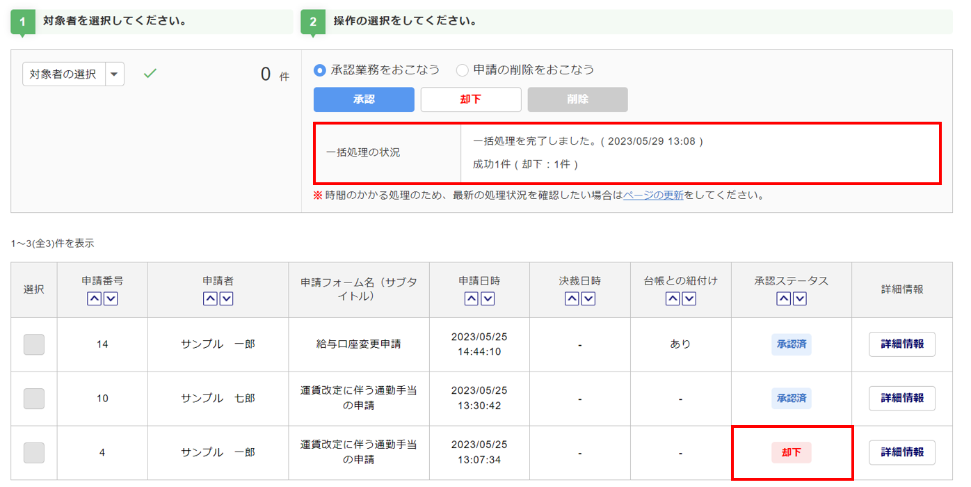 ※下図は、「申請番号:4」を選択し、[却下]クリック後の状態になります。
