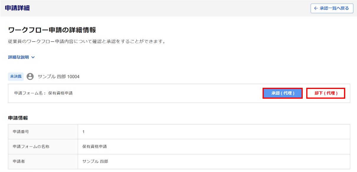 また、「管理者」権限かつ「代理承認可」の利用者の場合は、承認(決裁)の操作をおこなえます。