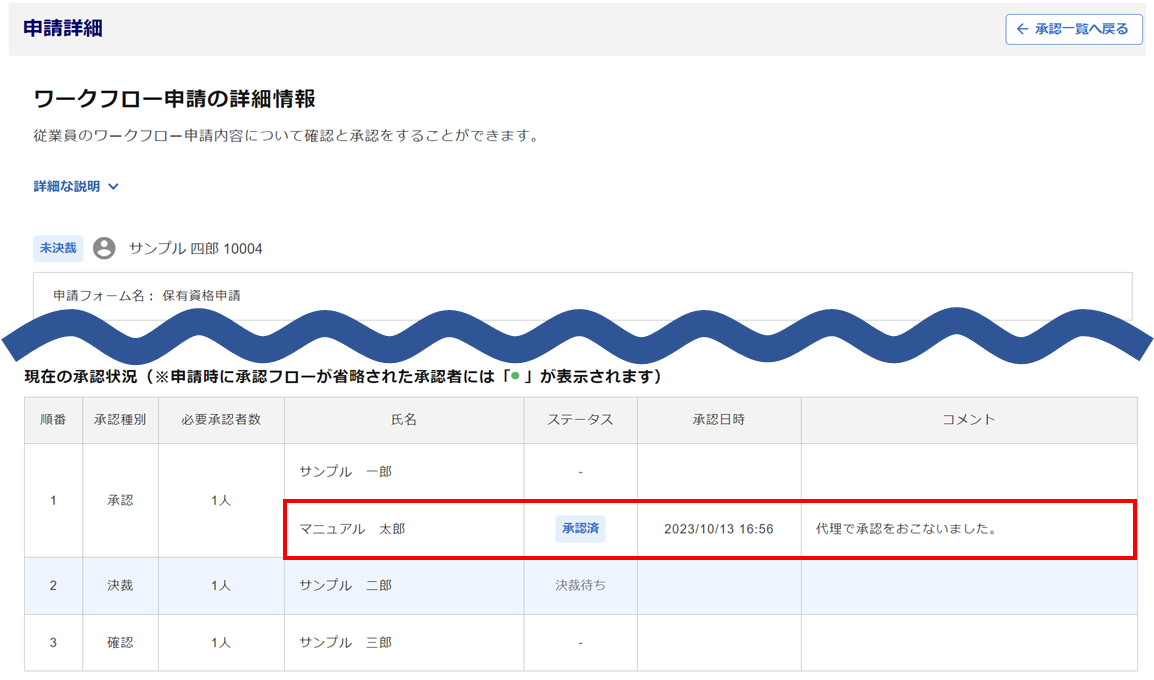 代理承認・却下した内容が、元の承認経路に追加されて表示されます。