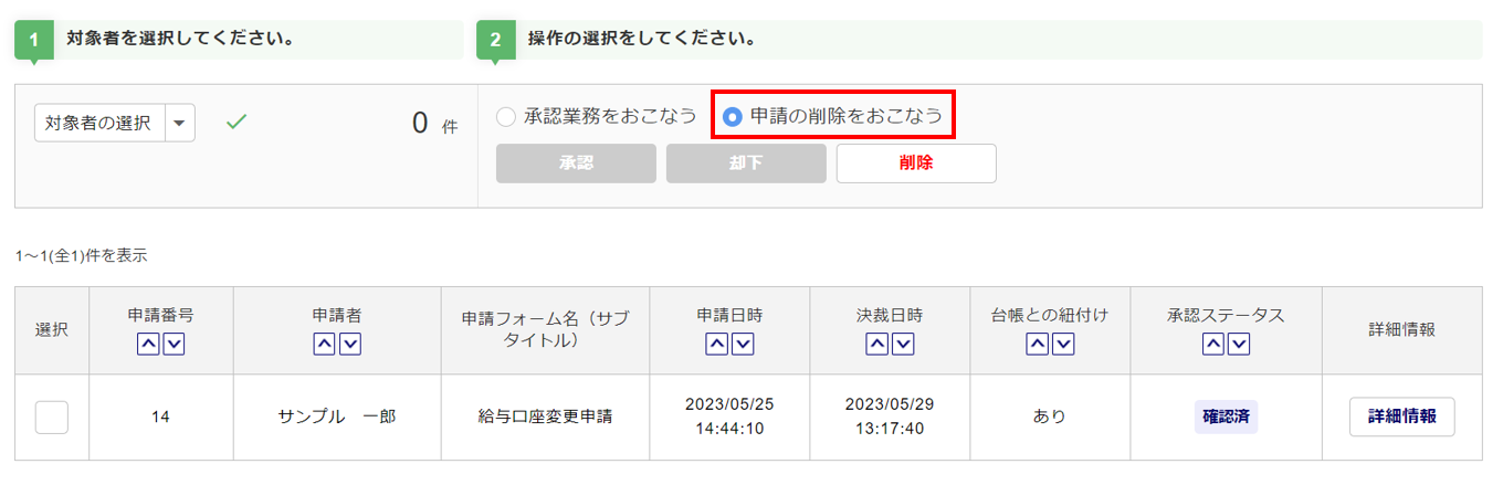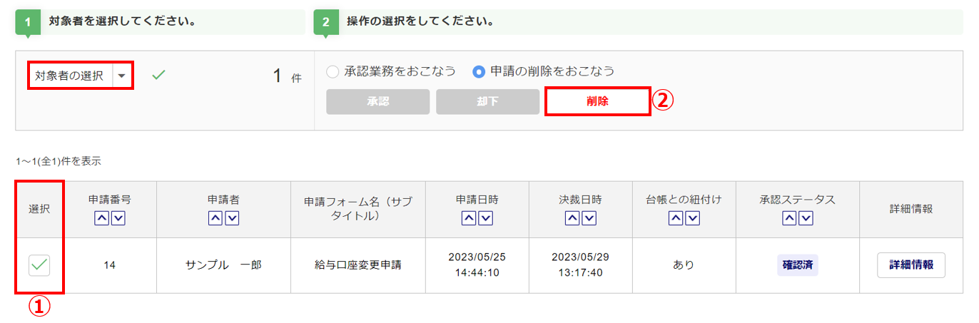 削除対象の申請の「選択」列(①)をチェックし、[削除](②)をクリックします。