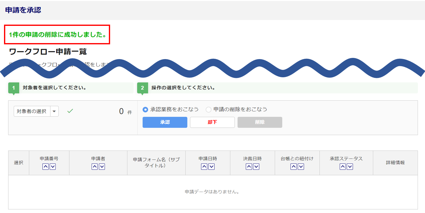 画面上部に「〇件の申請の削除に成功しました。」と表示され、一覧から対象の申請情報が削除されます。