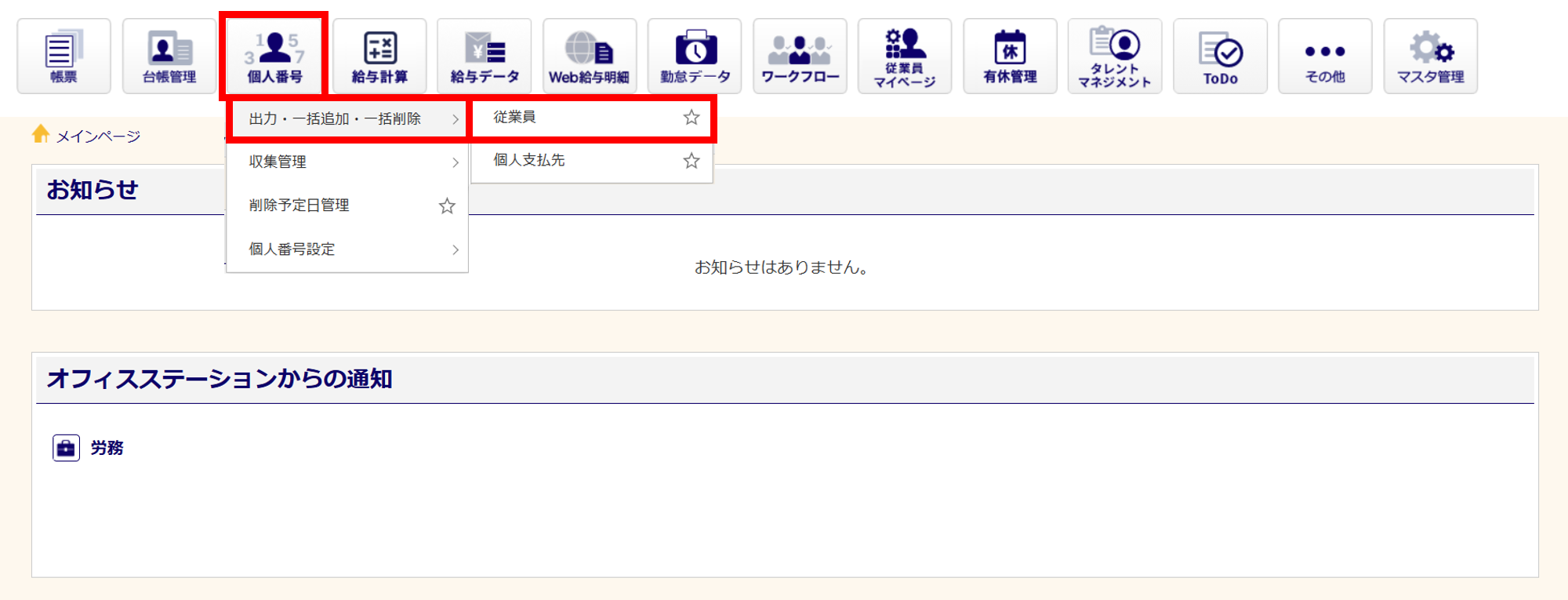 [個人番号]>[出力・一括追加・一括削除]をクリックします。