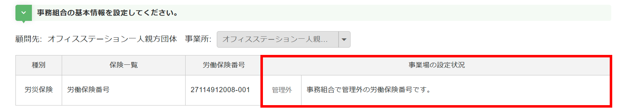 事業場の設定状況列に「管理外:事務組合で管理外の労働保険番号です。」と表示されている場合、「基幹番号」の登録作業が完了されておりません。本操作をおこなうには、先に「基幹番号」の登録をお願いします。