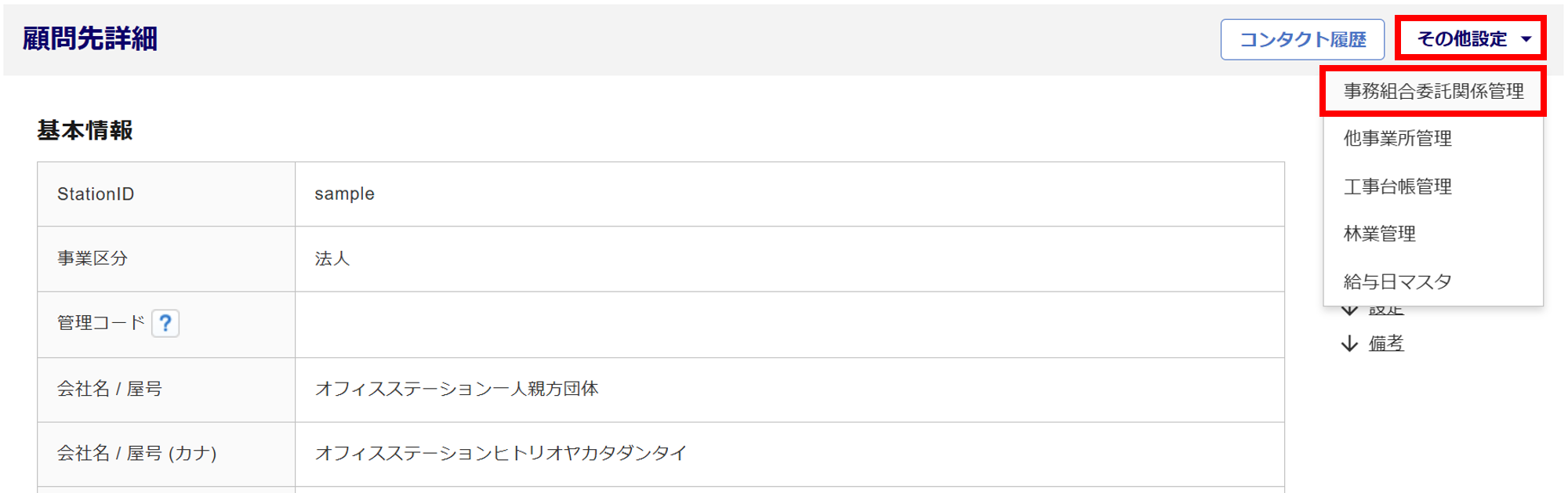[その他設定]>[事務組合委託関係管理]をクリックします。