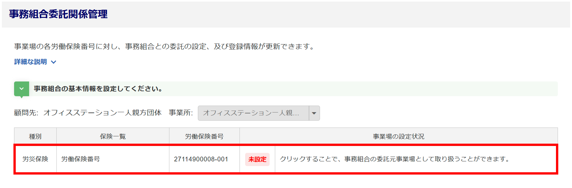 事業場の設定状況列に「管理外:事務組合で管理外の労働保険番号です。」と表示されている場合、「基幹番号」の登録作業が完了されておりません。本操作をおこなうには、先に「基幹番号」の登録をお願いします。
