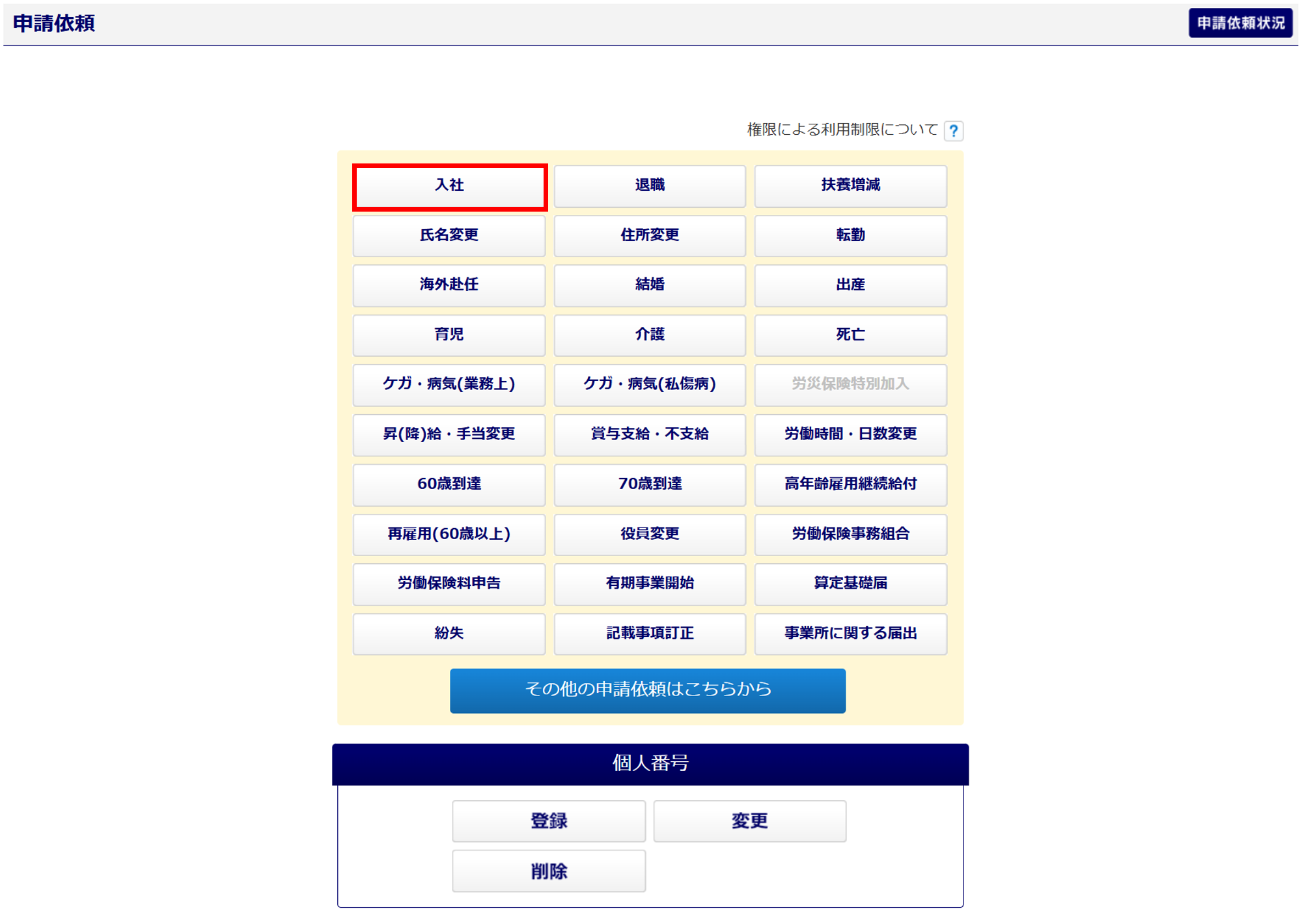 利用者の「給与情報の取り扱い」が「不可」となっている場合、「申請依頼」画面の[入社]ボタンがグレーアウトし、申請をおこなうことができません。[マスタ管理]>[利用者管理]をご確認ください。