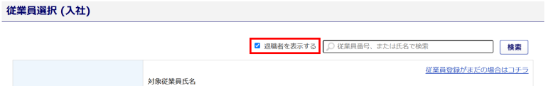 「退職者を表示する」にチェック、[検索]をクリックすると退職者が表示されます。