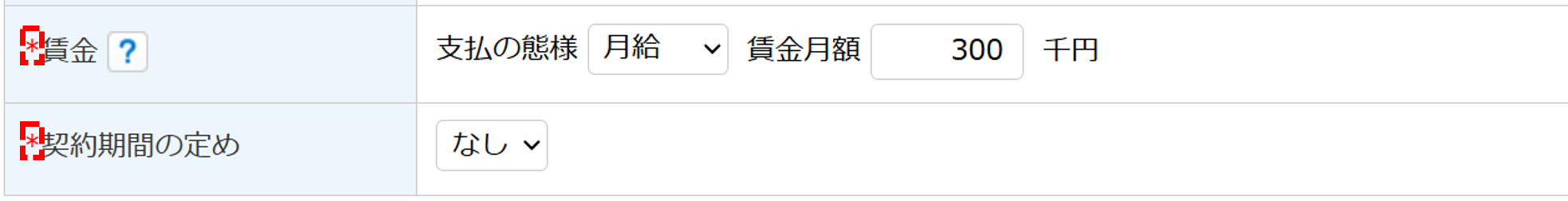 | 契約期間の定め | 契約期間の有無を選択します。 「あり」を選択した場合に「契約期間開始日」「契約期間終了日」「契約更新条項の有無」を入力します。 |