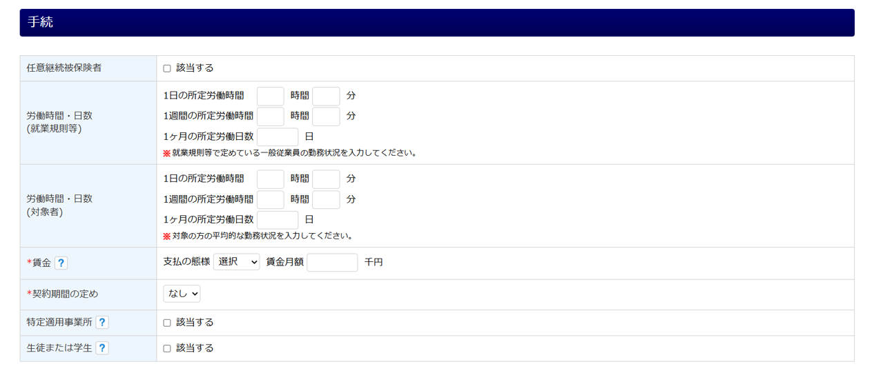 「特定適用事業所」と「生徒または学生」の項目は、「労働時間・日数(対象者)」が「労働時間・日数(就業規則等)」の4分の3以上の場合、非表示となります。