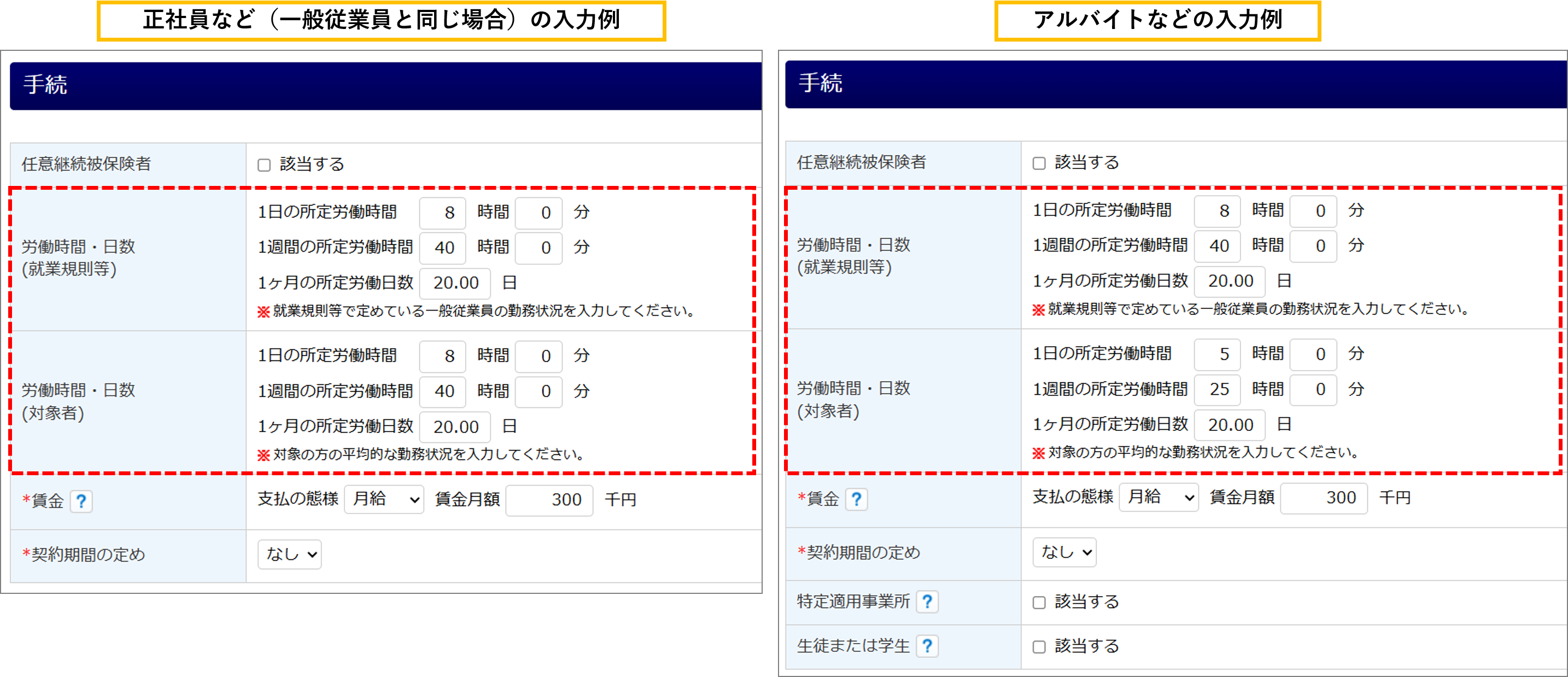 例)1週間の所定労働時間:「40時間」、1ヶ月の所定労働日数:「20日」の場合は、