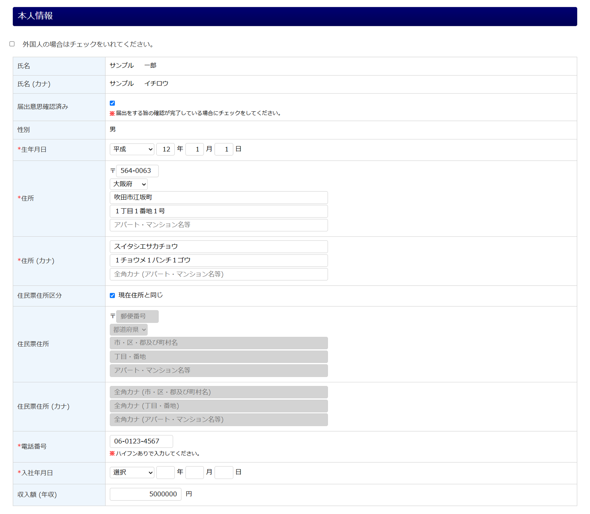 | 賃金 | 「本人情報」カテゴリ欄の「入社年月日」に入力する年月日時点の「支払の態様」「賃金月額」を入力します。 ※1,000円未満は四捨五入してください。 |