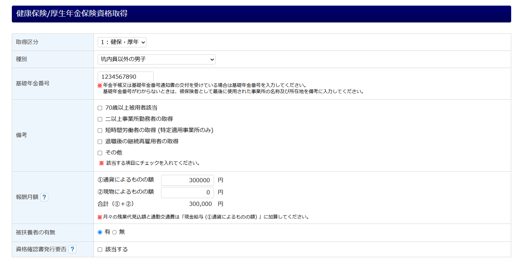 健康保険/厚生年金保険資格取得各項目を入力します。