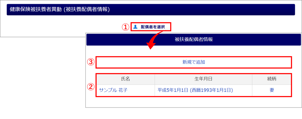 従業員台帳に配偶者の情報を登録していない場合は、[新規で追加](③)をクリックします。