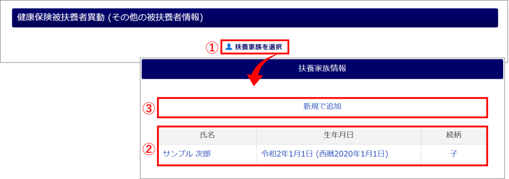 従業員台帳に扶養家族の情報を登録していない場合は、[新規で追加](③)をクリックします。