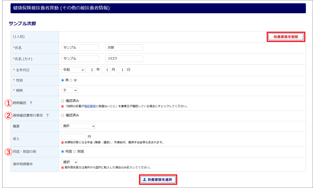 番号 項目 説明 ① 続柄確認 事業主が戸籍謄本等で、従業員と被扶養者の続柄を確認している場合にチェックします。 ② 資格確認書発行要否 新たに被保険者や被扶養者になる方が、資格確認書を必要とする場合にチェックします。 ③ 同居・別居の別 従業員と同居か否かを選択します。