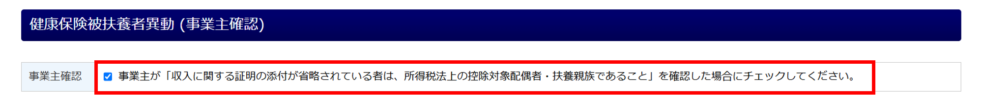収入要件確認のための添付書類が省略されている被扶養者が、所得税法上の控除対象配偶者・扶養親族であることを事業主が確認している場合、「事業主確認」にチェックします。