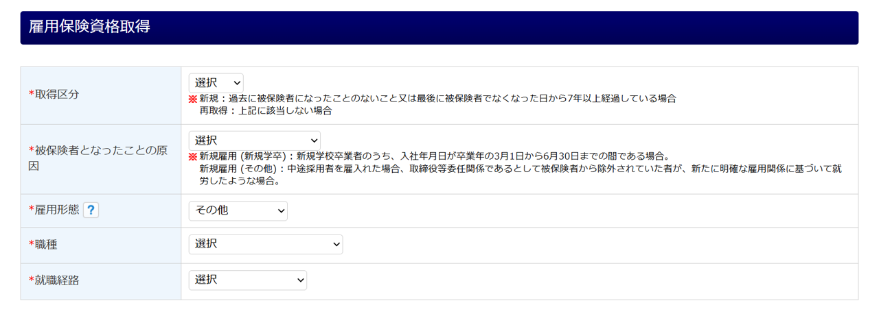 雇用保険資格取得各項目を入力します。