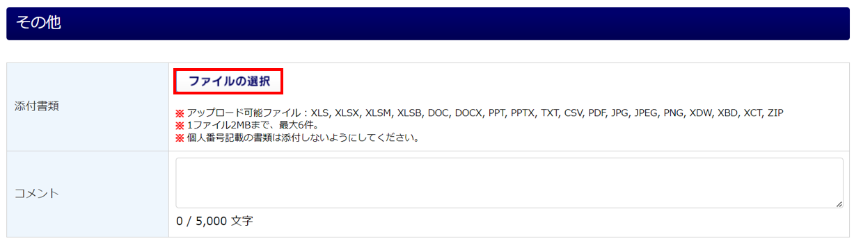 「添付書類」項目には、個人番号記載の書類は添付しないようにしてください。
