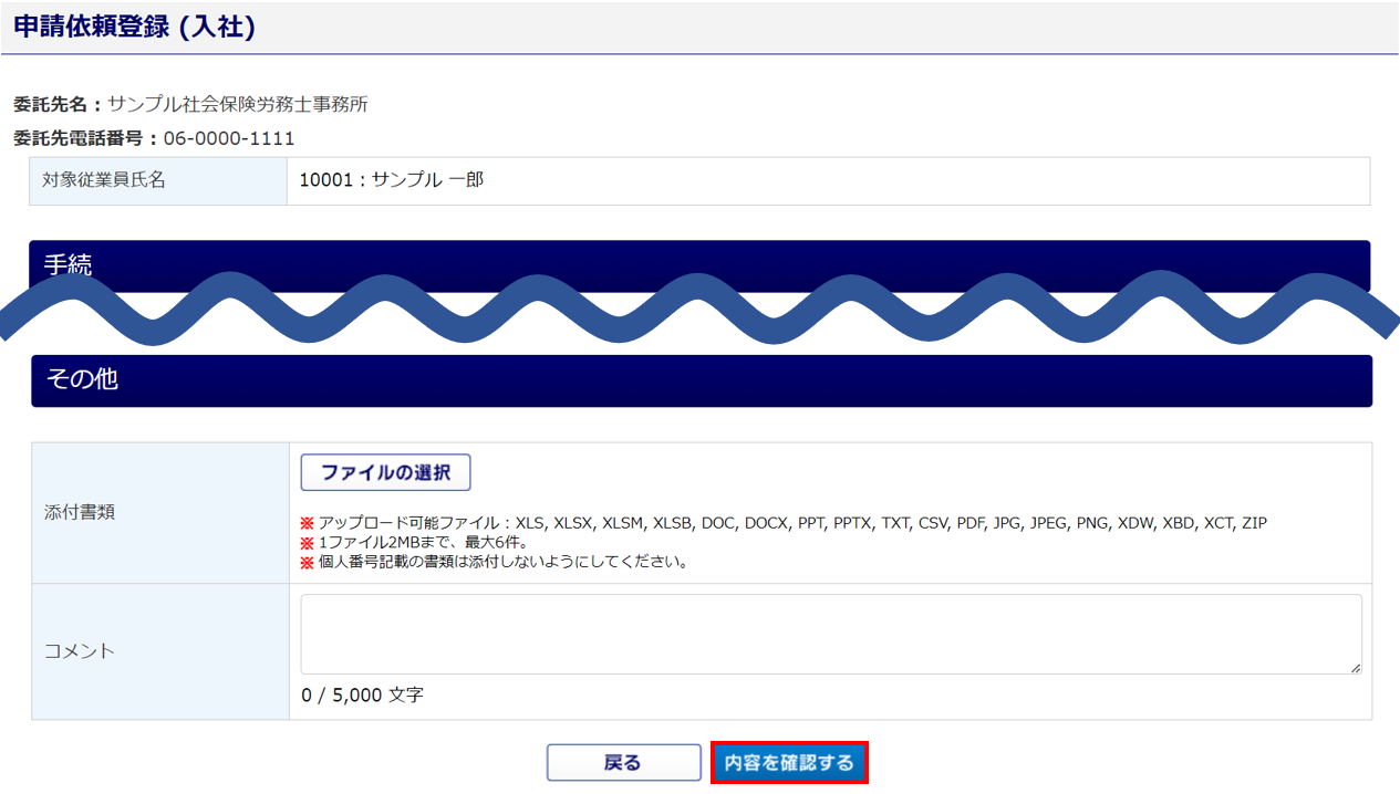 委託先社労士に対してコメントがある場合は、「コメント」に入力します。