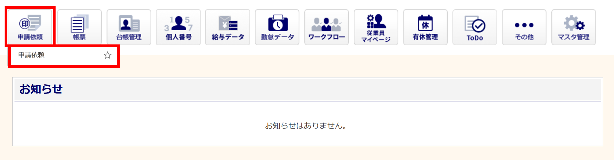 [申請依頼]アイコンが表示されていない場合、[マスタ管理]>[利用者管理]をご確認ください。