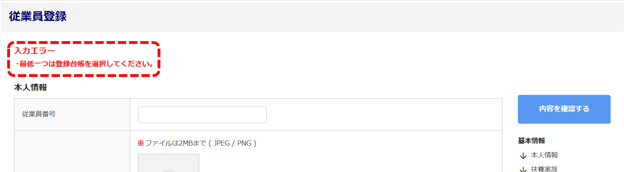 「登録台帳」を最低でも1つ選択してから、従業員台帳の登録をお願いします。