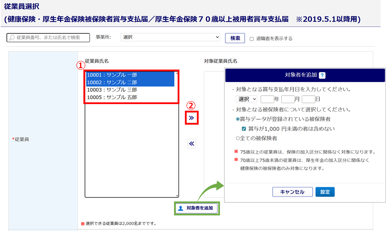 [対象者を追加]をクリックすると、設定した条件を満たす対象従業員を自動で選択します(条件を満たす対象者が「対象従業員氏名」欄に移動)。