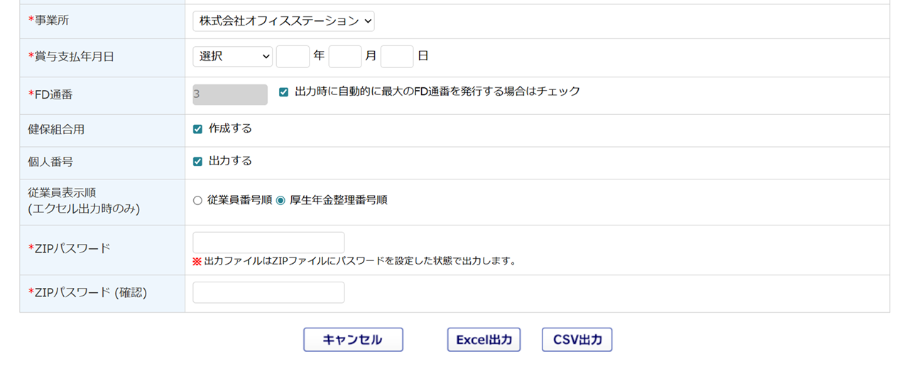 出力したファイルを開く際に利用するパスワードを入力します。 ※「個人番号」の「出力する」にチェックした場合に表示されます。 |