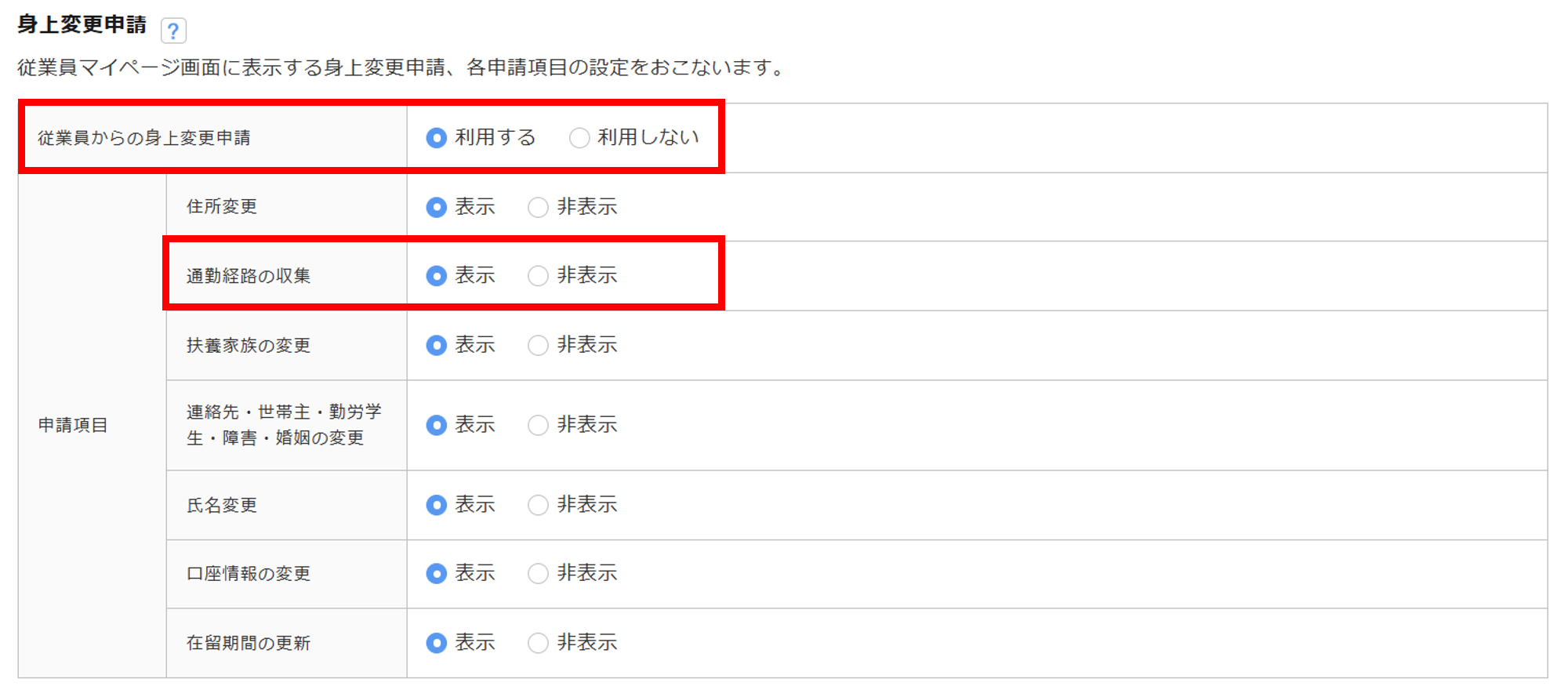 - 「従業員からの身上変更申請」に「利用する」を選択、かつ「申請項目・通勤経路の収集」に「表示」を選択