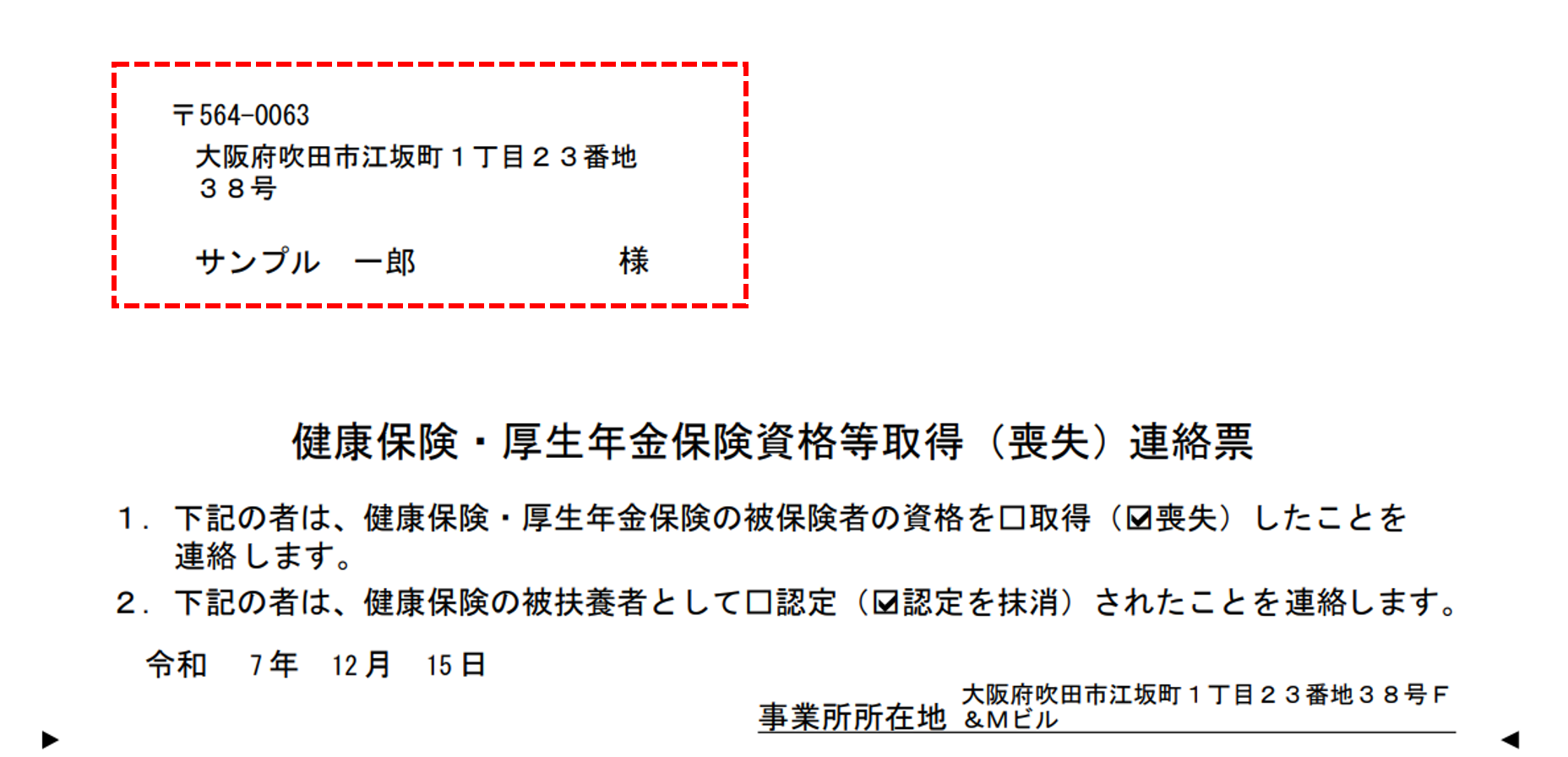 「窓あき封筒用」にチェックを入れて、PDF出力した場合、書面の左上に被保険者の氏名と住所が出力されます。