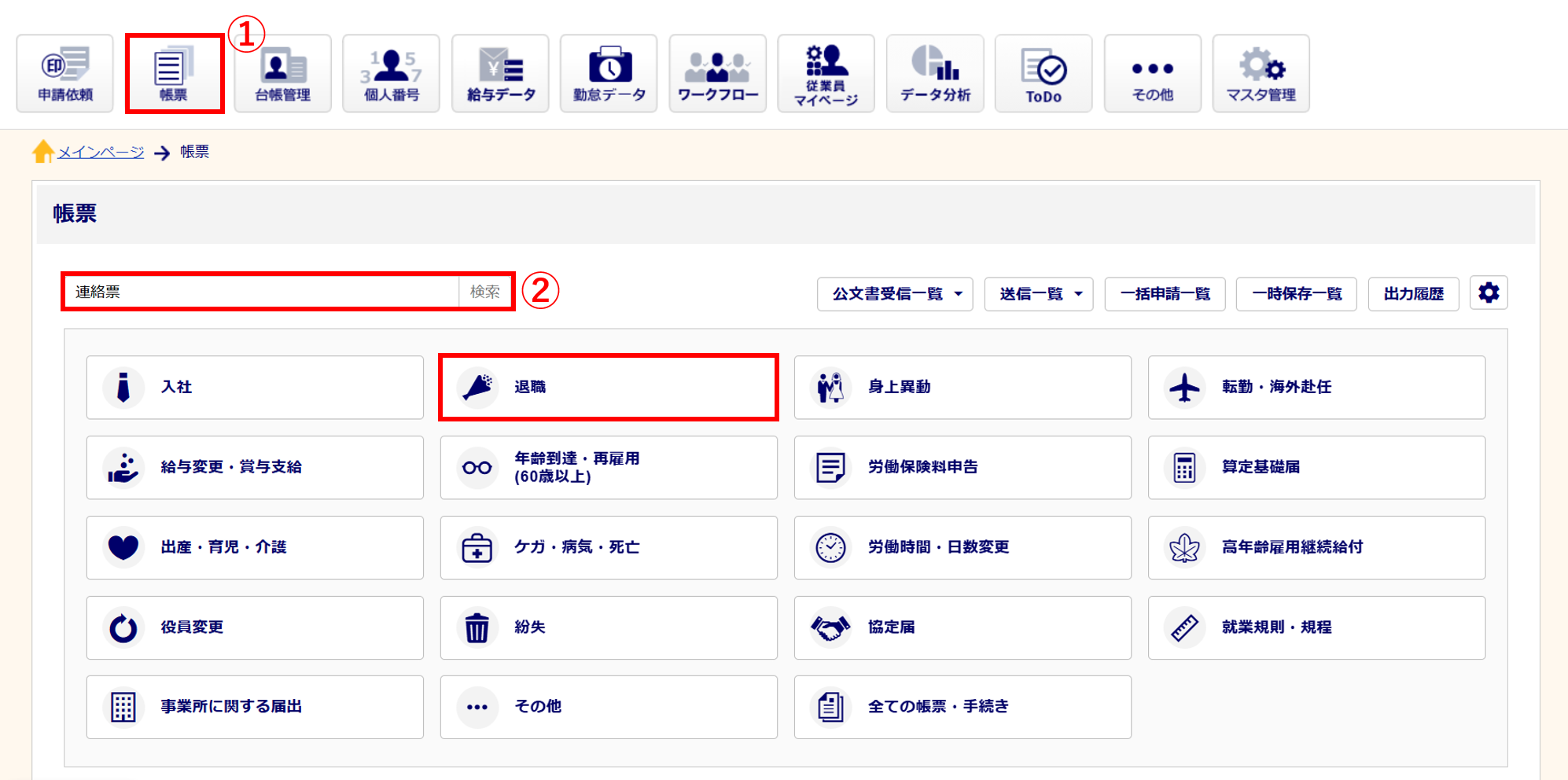 [帳票](①)をクリックし、検索窓(➁)に帳票名または帳票名の一部を入力し[検索]をクリックします。
