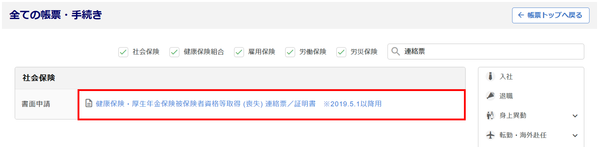 「健康保険・厚生年金保険被保険者資格等取得 (喪失) 連絡票/証明書」をクリックします。