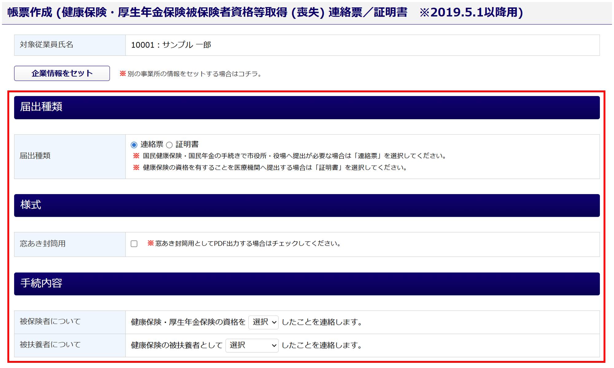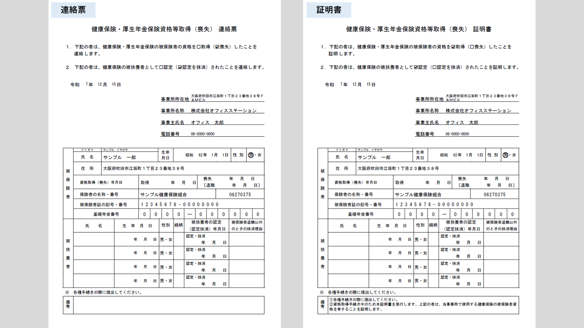 「帳票作成」画面より、「健康保険・厚生年金保険資格等取得(喪失)連絡票」または「健康保険・厚生年金保険資格等取得(喪失)証明書」を作成し、PDFファイル形式にて出力することができます。