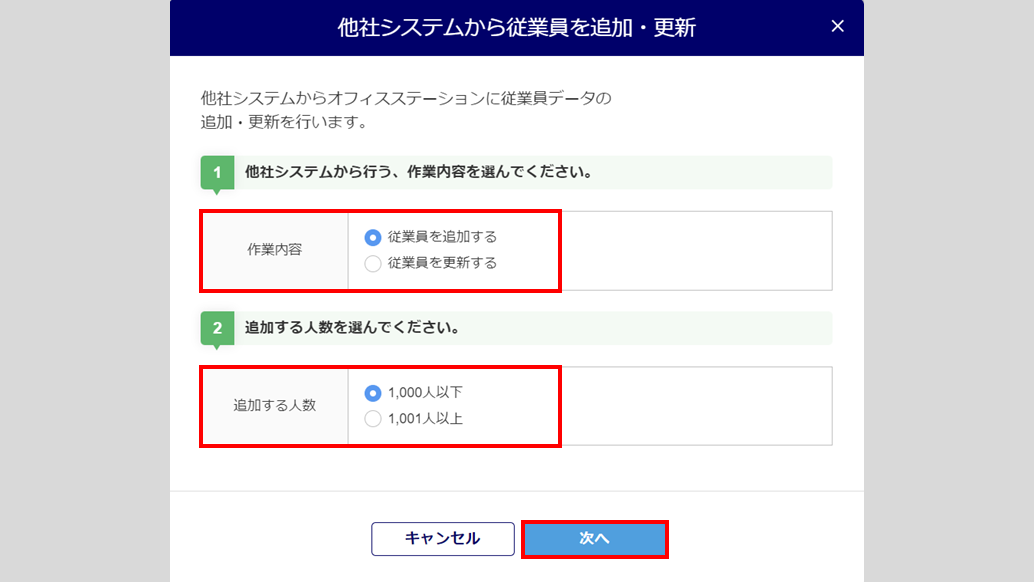 「作業内容」に「従業員を追加する」、「追加する人数」に「1,000人以下」を選択し、[次へ]をクリックします。