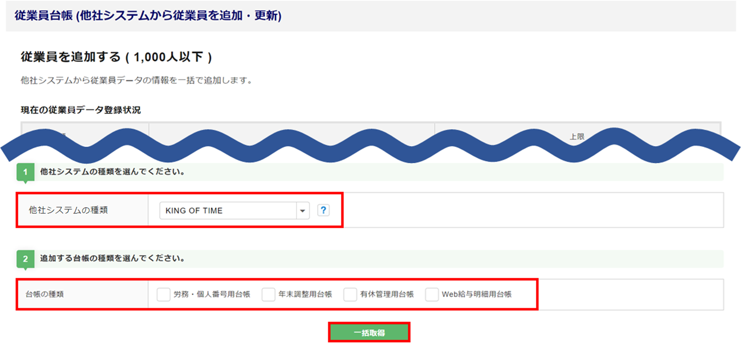 オフィスステーションの従業員台帳の情報を、KING OF TIMEへ一括で登録または更新をおこないます。