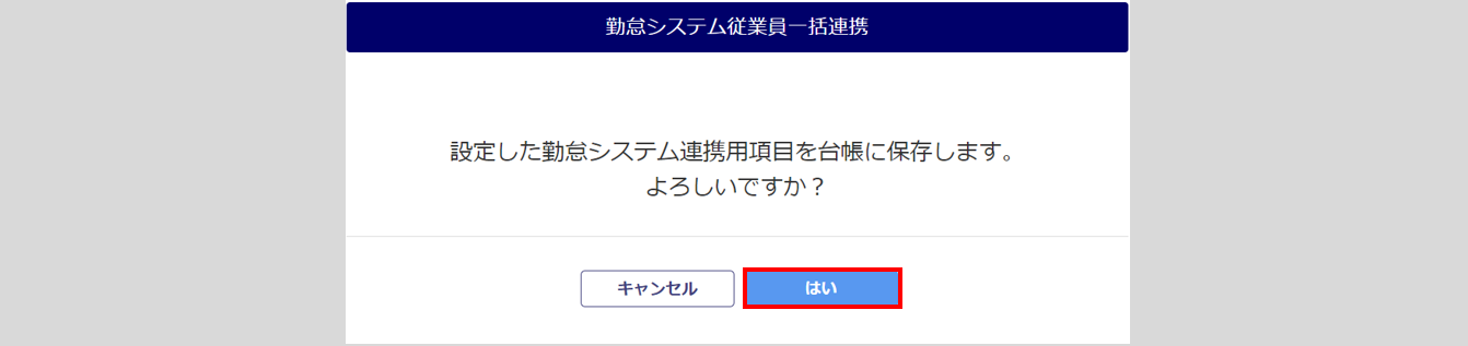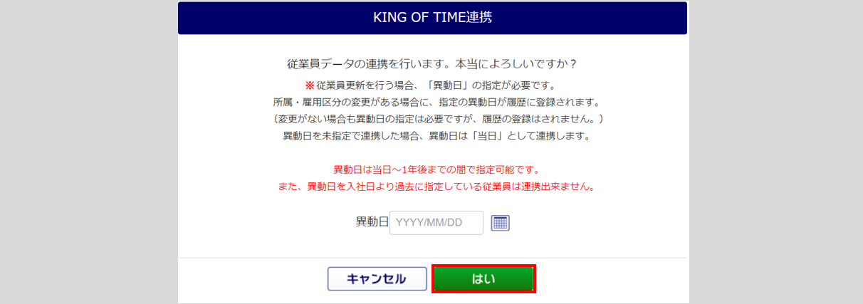 「KING OF TIME連携」ウィンドウが表示されます。[はい]をクリックします。