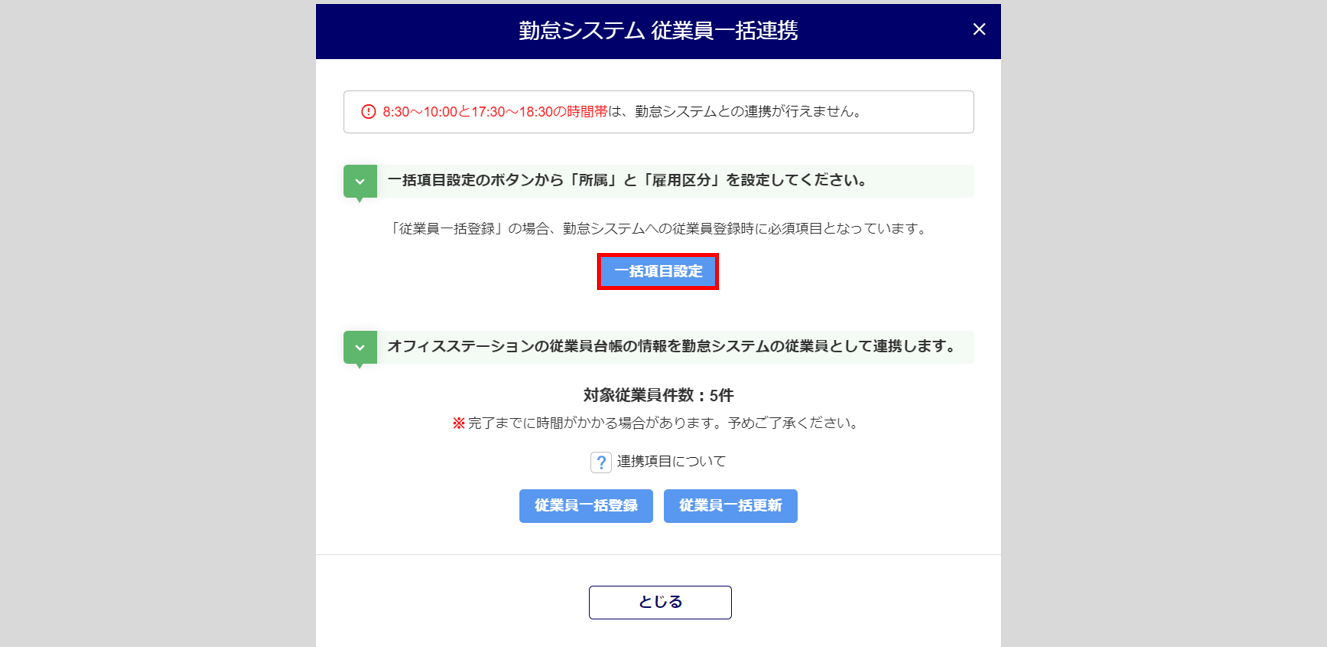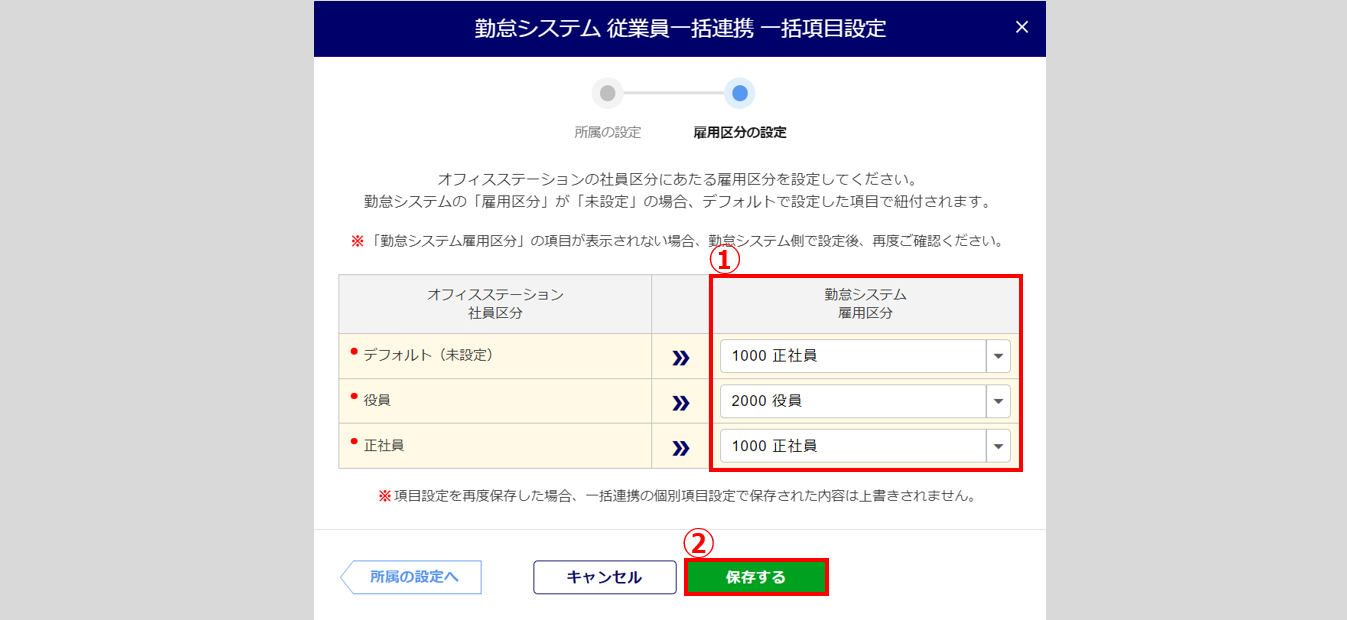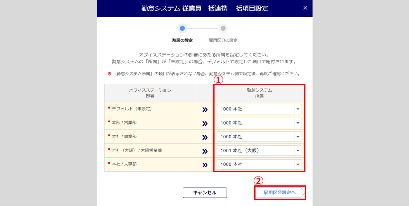 従業員一括登録、または、所属・雇用区分の変更を含む従業員一括更新の場合の場合、勤怠システムの必須項目である「所属」「雇用区分」の紐付ける一括項目設定をおこないます。