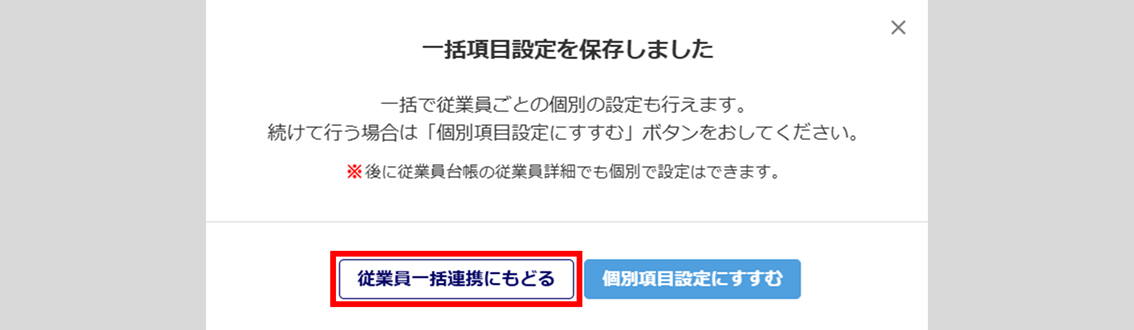 従業員ごとの個別設定が不要の場合、[従業員一括連携にもどる]をクリックします。