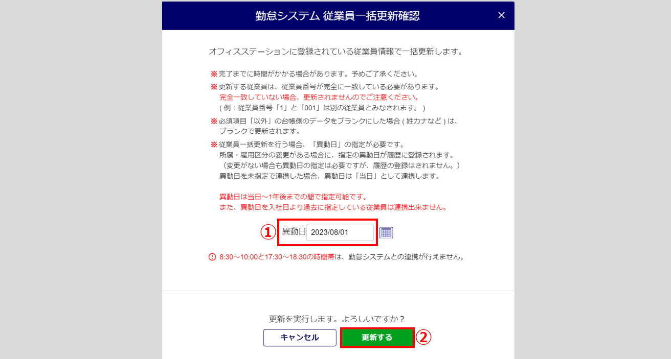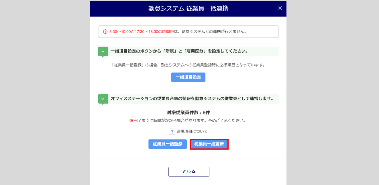 所属・雇用区分の変更を含まない従業員一括更新の場合の場合は、本マニュアル内「従業員一括連携」にお進みください。