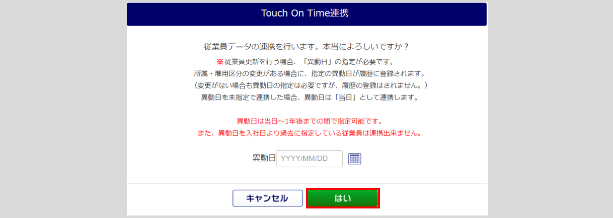 「Touch On Time連携」ウィンドウが表示されます。[はい]をクリックします。