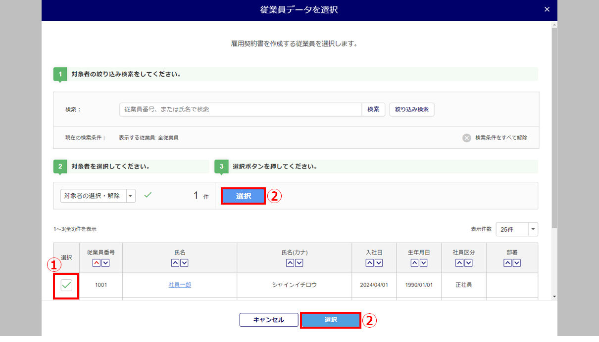 対象従業員の「選択」列にチェックし、[選択]をクリックします。