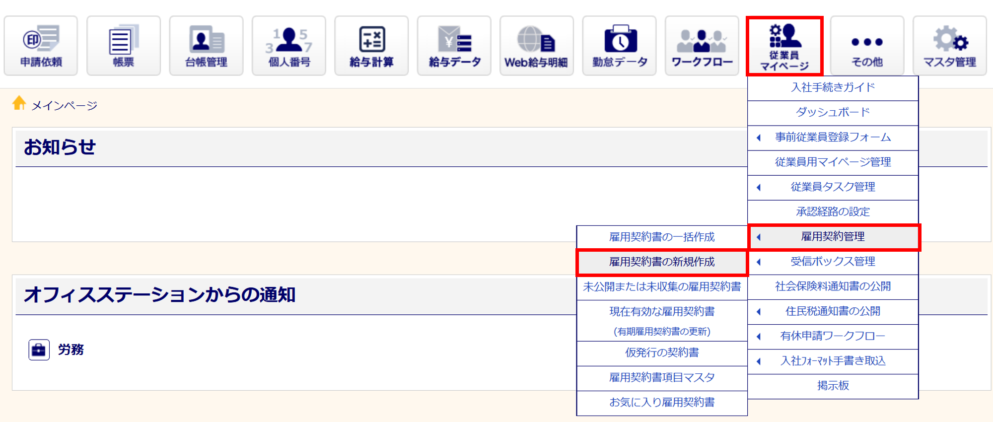 従業員マイページを発行していない従業員は、オフィスステーション内で雇用契約書の合意が取れません。