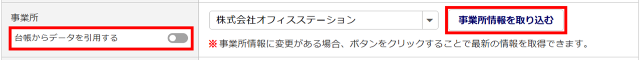 「署名欄」カテゴリの「事業所」を、既存の雇用契約書やお気に入り契約書から反映し、かつ情報に変更がある場合は、「事業所」の「台帳からデータを引用する」を無効にし、[事業所情報を取り込む]をクリックすると最新の事業所情報を取得できます。