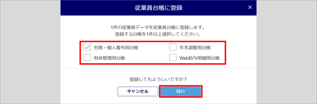 登録する台帳にチェックし、[はい]をクリックします。