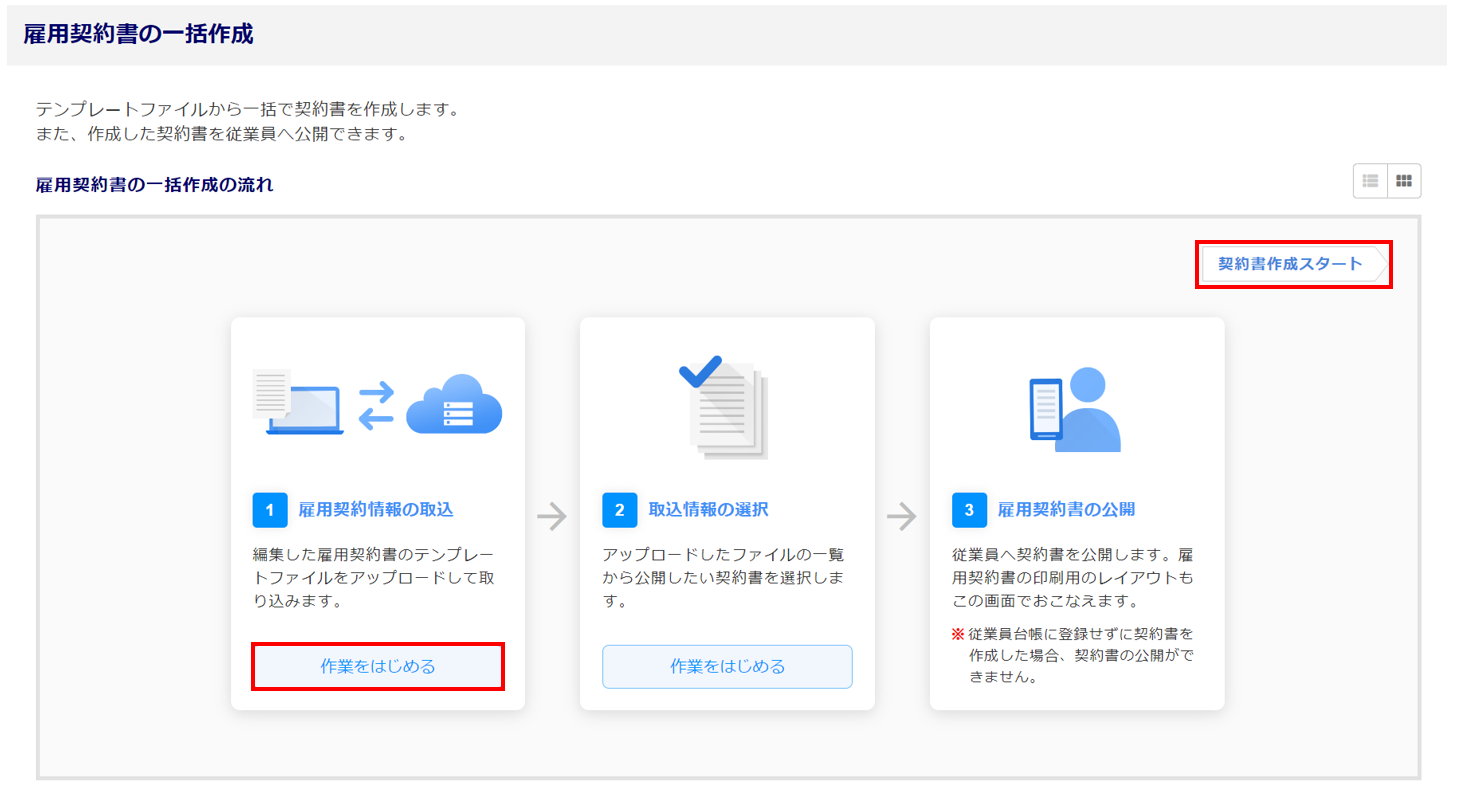 [契約書作成スタート]もしくは「雇用契約情報の取込」の[作業をはじめる]をクリックします。