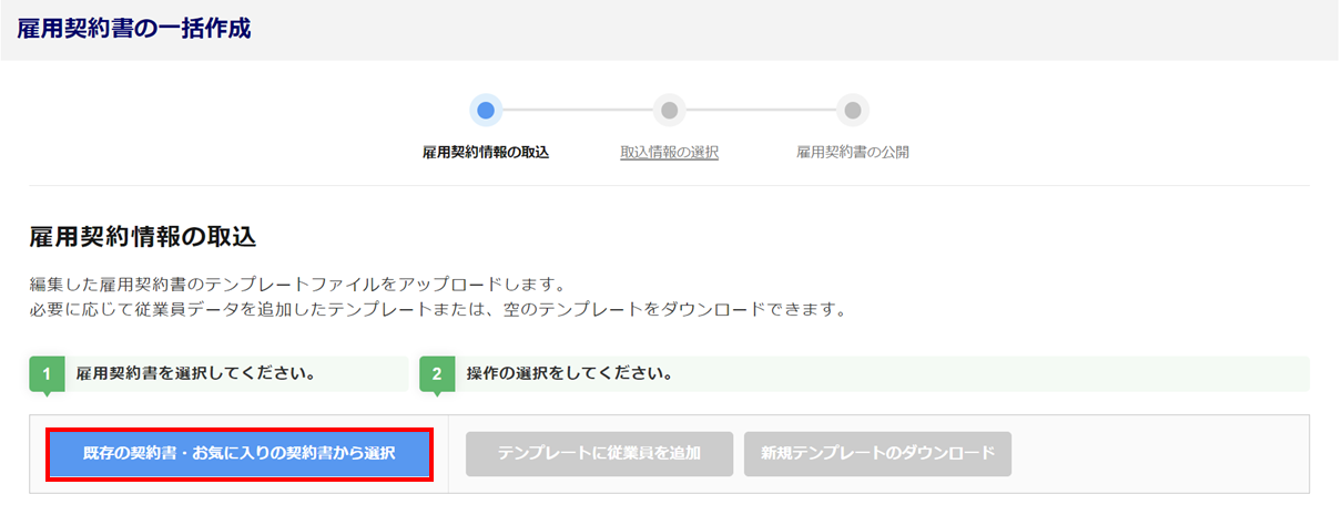 選択肢説明 現在有効な契約書から引用する 現在有効な契約書から内容を引用して作成します。 お気に入り雇用契約書から引用する お気に入り雇用契約書から内容を引用して作成します。