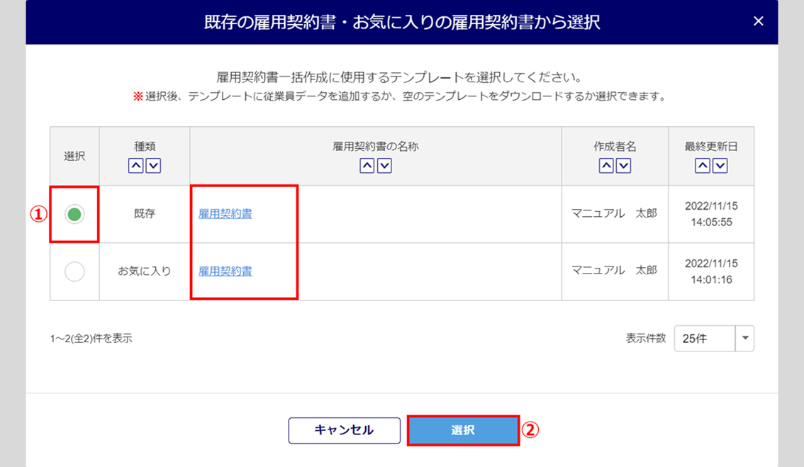 テンプレートとして使用する雇用契約書の「選択」列(①)を選択し、[選択](②)をクリックします。