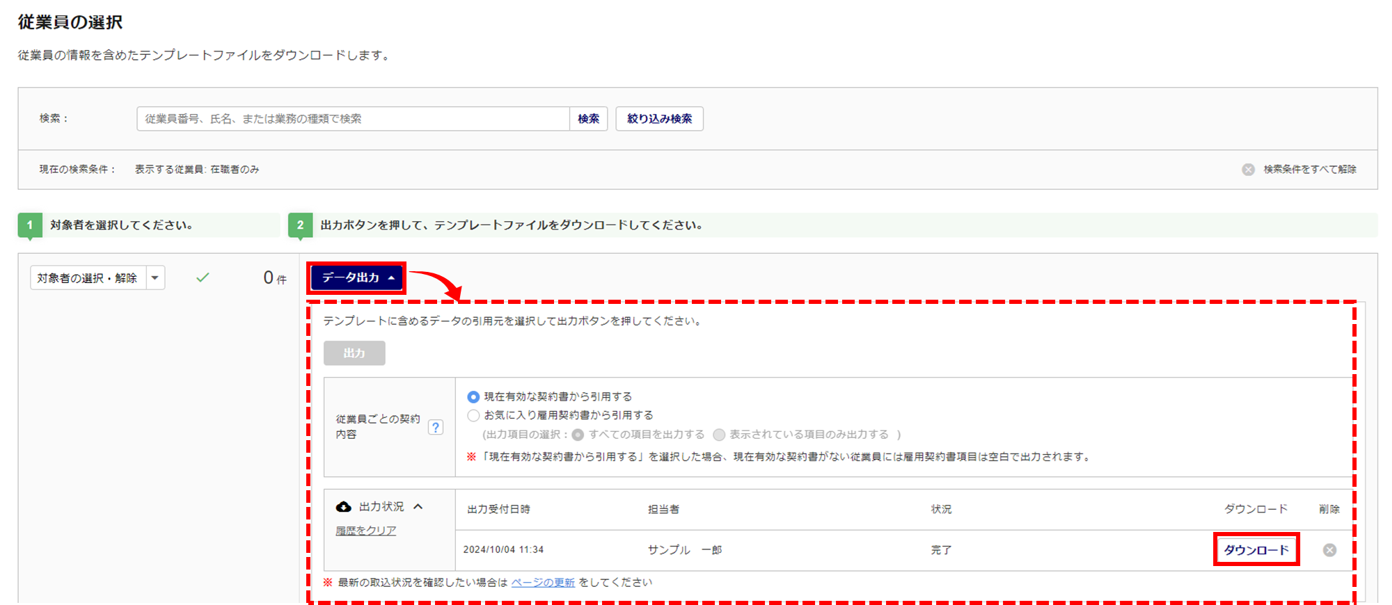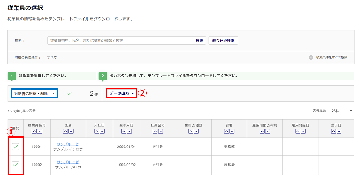 対象従業員の「選択」列(①)にチェックをつけ、[データ出力](②)をクリックします。