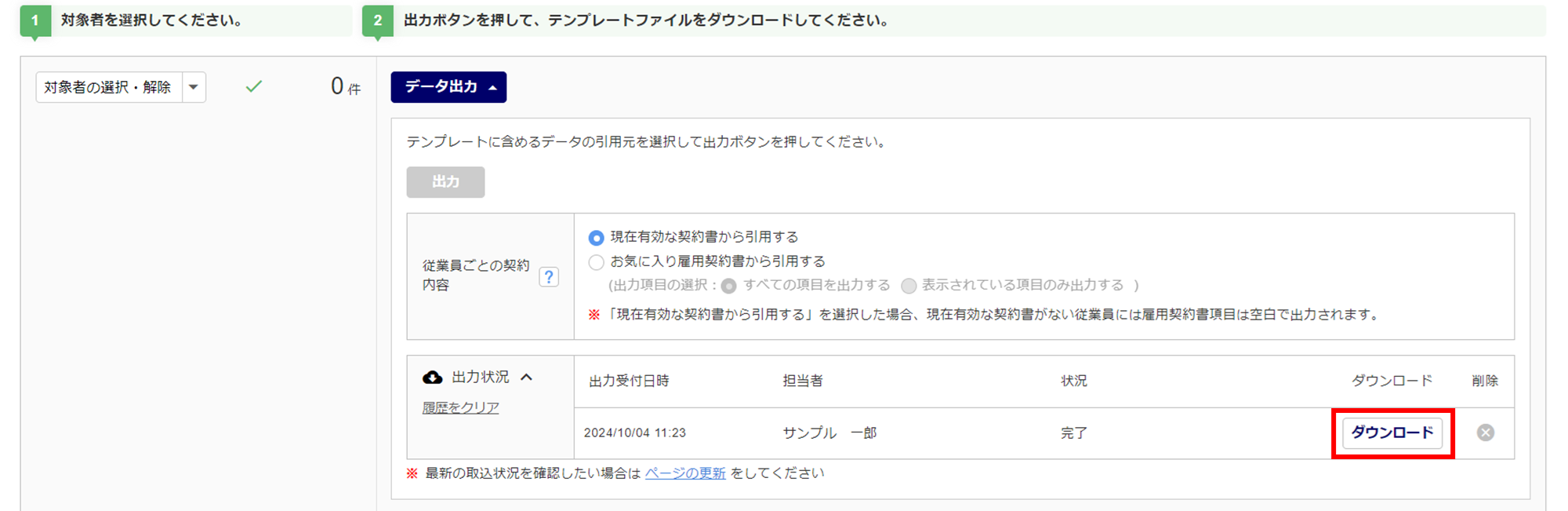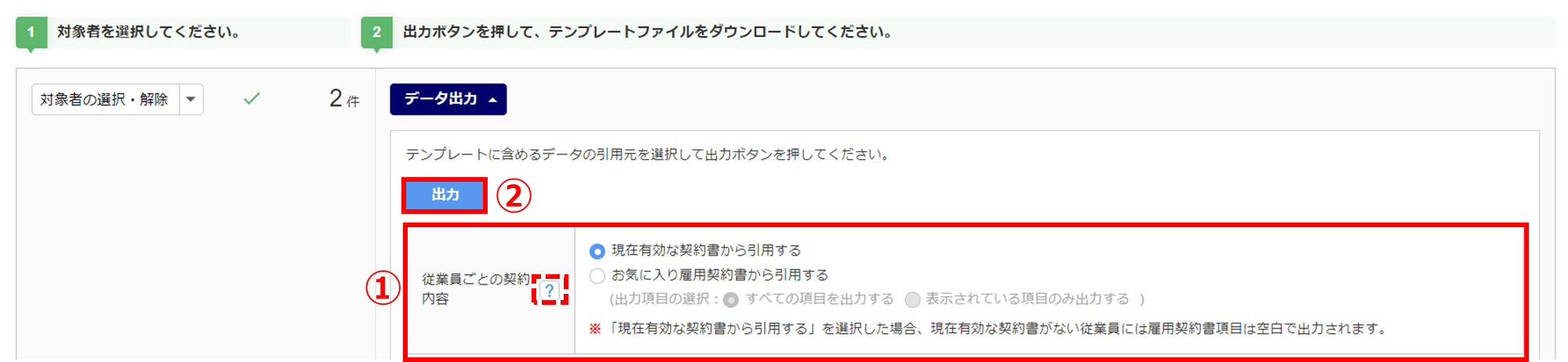 本マニュアル内「雇用契約書の選択」にて、「お気に入り契約書」を選択した場合、テンプレートに出力するデータの引用元を「従業員ごとの契約内容」(①)で選択し、[出力](②)をクリックします。