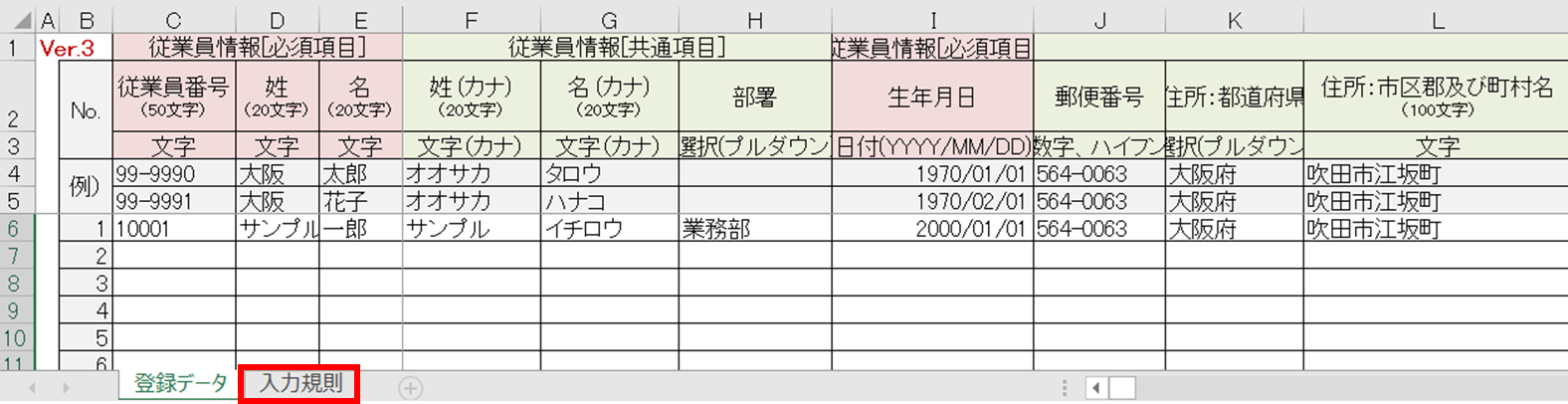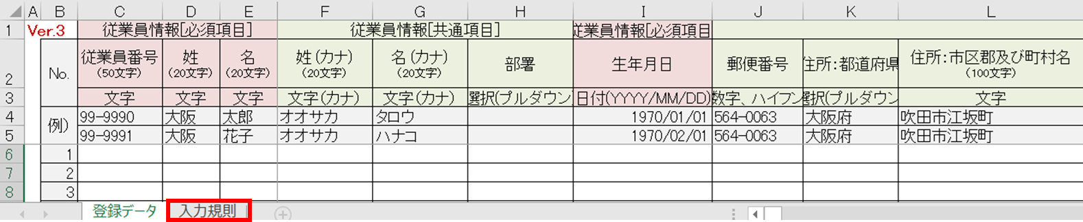 ・各項目の入力規則は、ファイル左下の「入力規則」シートをご確認ください。 - 既存の従業員データを追加しない場合